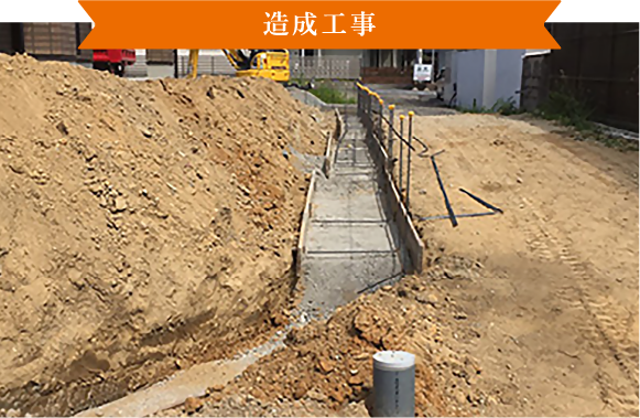 造成工事 先行工事 土留めブロック工事 CP 型枠ブロック工事 RC 擁壁工事外壁塗装工事 外壁サイディング工事 屋根塗装工事 屋根葺き替え工事 太陽光発電システム工事 蓄電池システム工事 造園工事 建物解体工事 解体工事 電気工事 給排水工事 設備工事 水道工事道路乗り入れ工事 アスファルト工事 貸し駐車場工事 砂利・採石敷工事