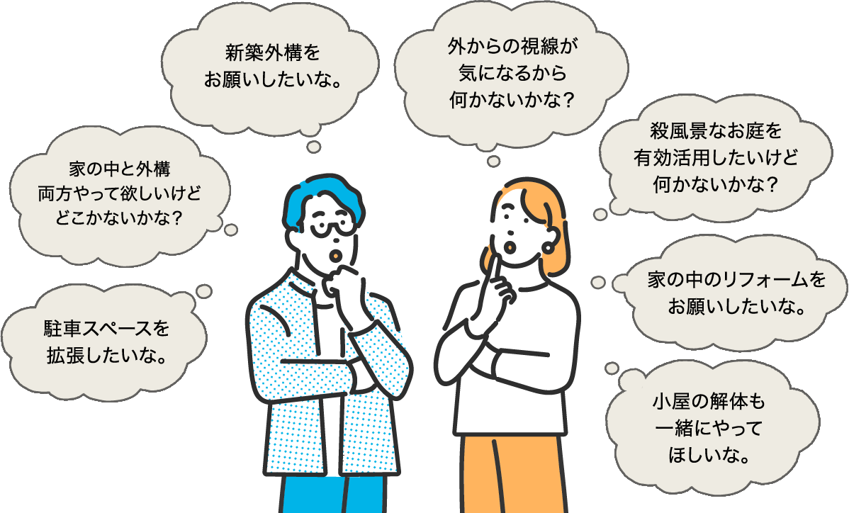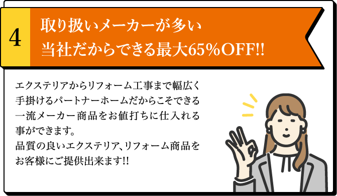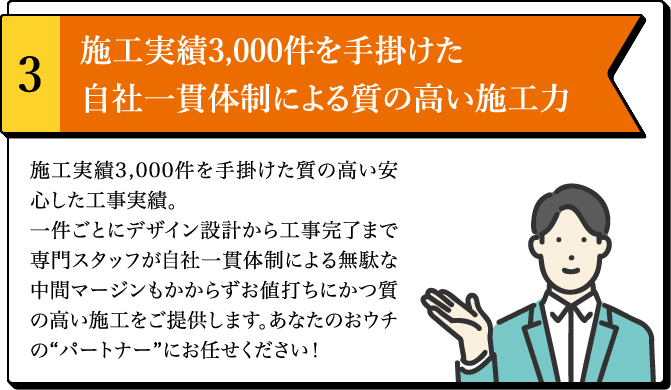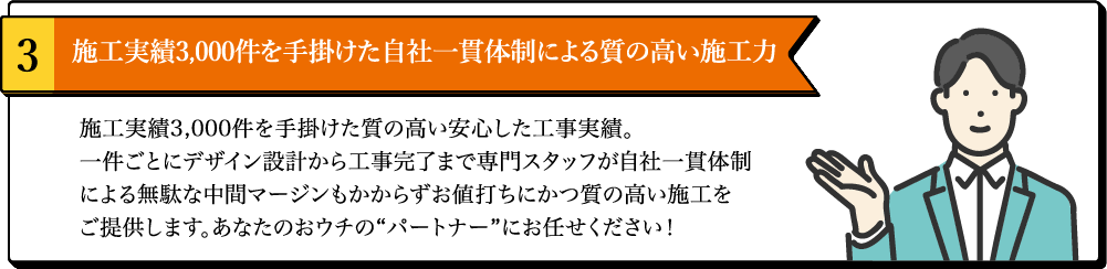 住まいのスペシャリスト パートナーホームなら 些細な工事から大がかりな工事まで 住まいの事なら何でもお任せください!! 施工累計3,000件の実績による質の高い施工力と経験豊富な専任スタッフによる高いデザイン力、 自社一貫体制で無駄な中間マージンもかからないコストパフォーマンスでお客様にご提供します。 住まいのスペシャリスト パートナーホームなら 些細な工事から大がかりな工事まで 住まいの事なら何でもお任せください!! × 印刷プレビュー