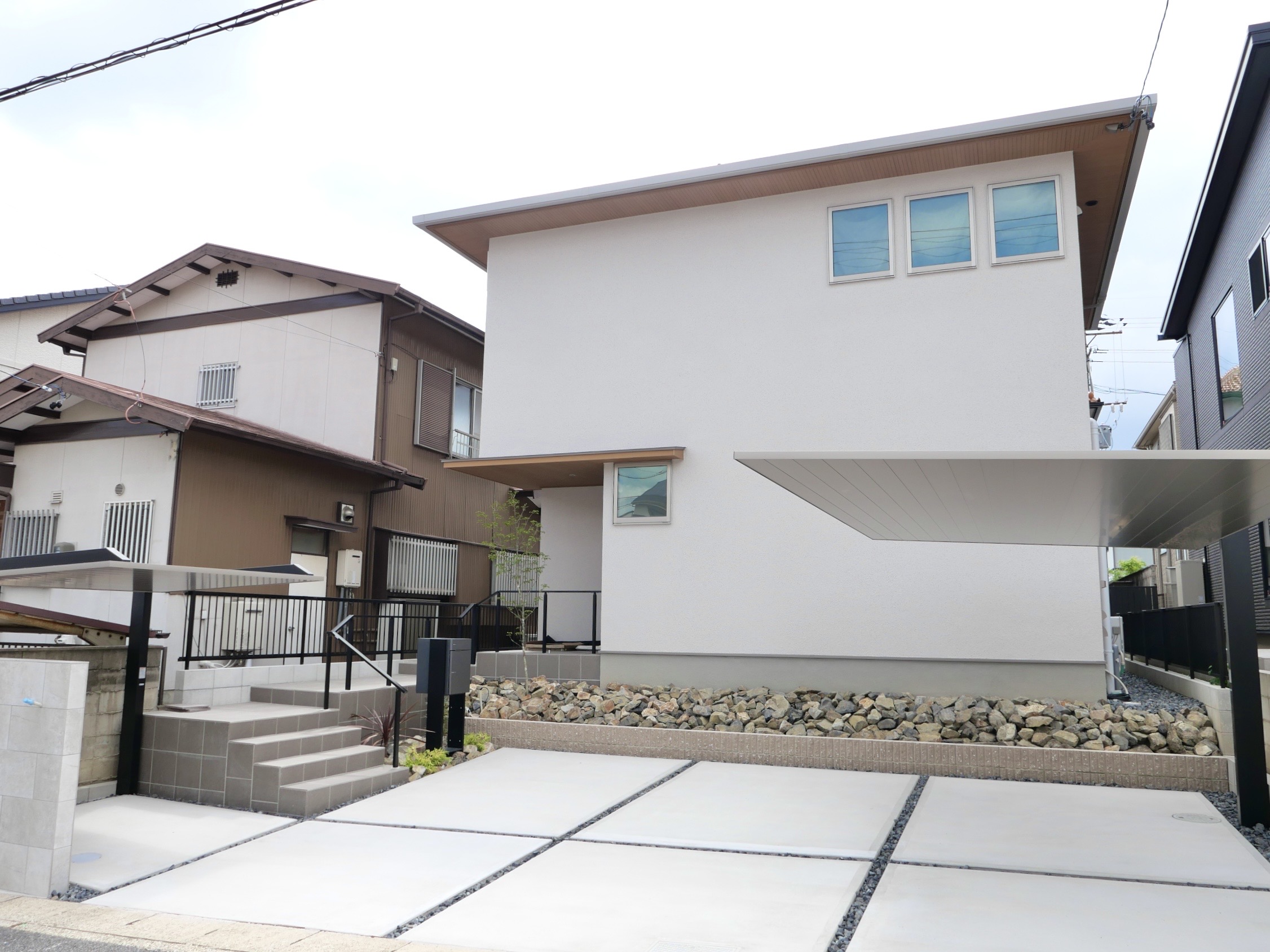 ホワイト×木目軒天の住宅が映える開放感のある広々としたオープン外構。お車と自転車・バイクの置ける駐車場のコンクリート土間は仕上げが整った印象に魅せる額縁仕上げです。