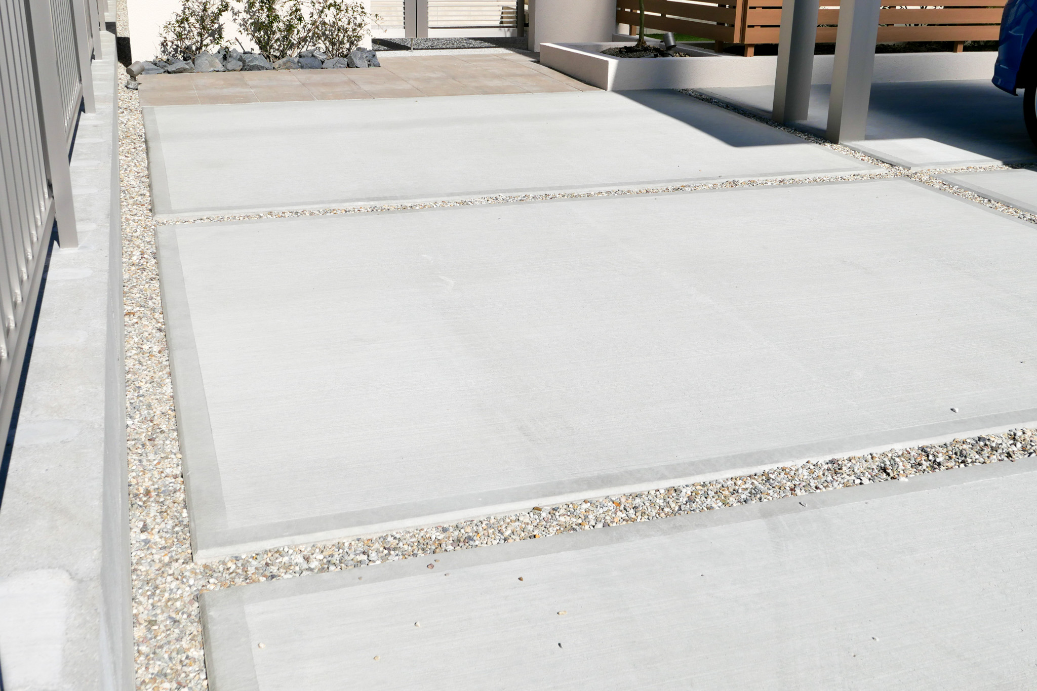 駐車場エリアには車の乗り入れや乗り降りの導線の邪魔にならない片支持柱カーポートを設置しました。後方に柱が位置しているため視覚的にも開放感のあるカースペースになります。