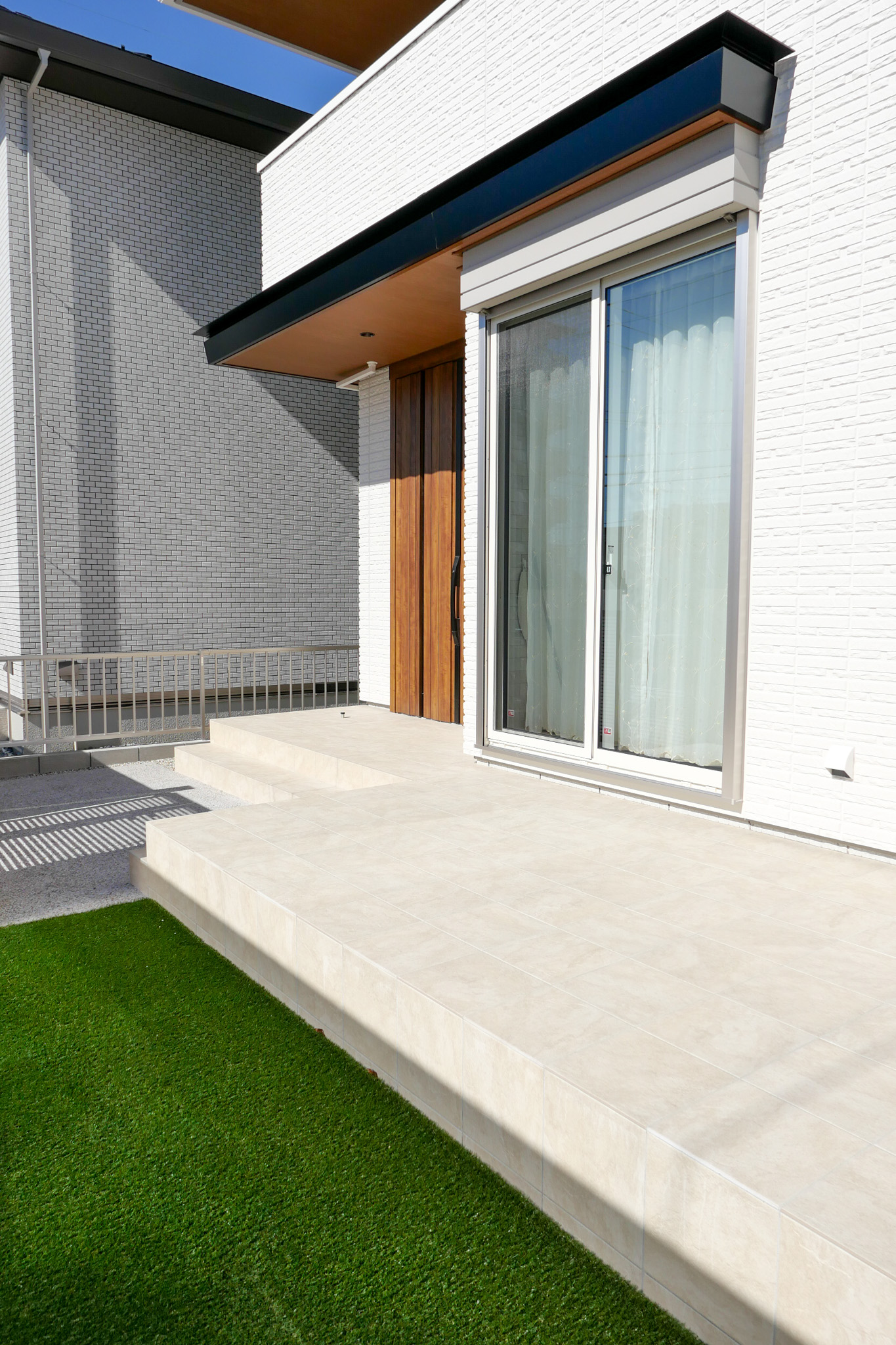 お庭部分は人工芝仕上げとし、玄関から繋がるタイルデッキを作成しました。