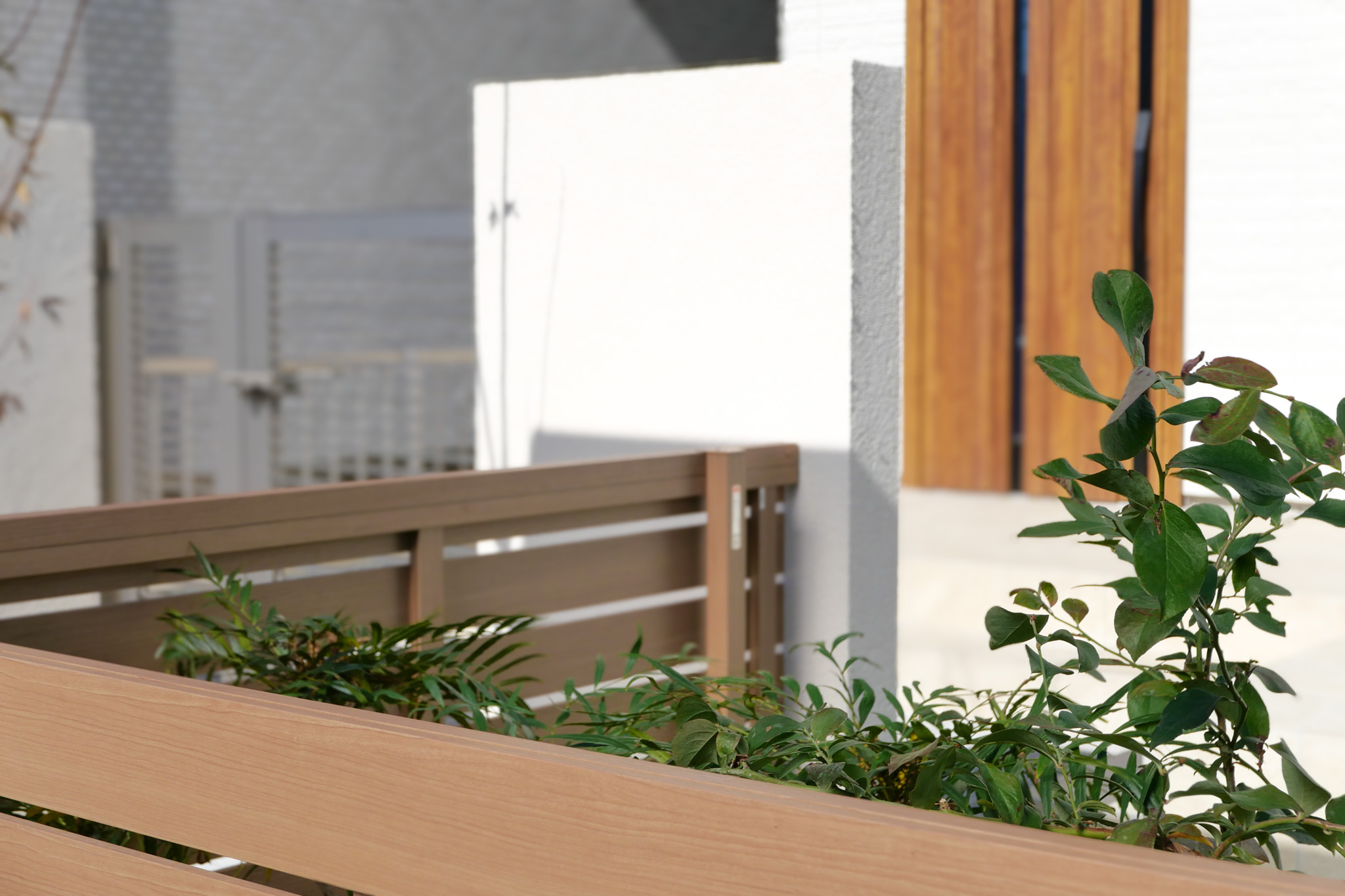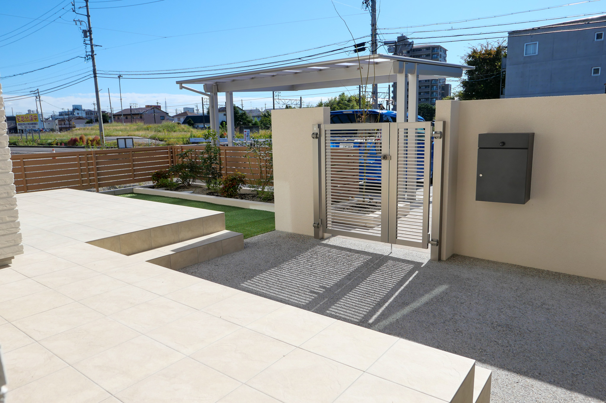 駐車場とお庭の敷地を仕切り適度なプライベート空間を確保できるセミクローズ外構とし、ホワイトを基調とした外観のアクセントである軒天と統一した木調の目隠しフェンスをセレクト。