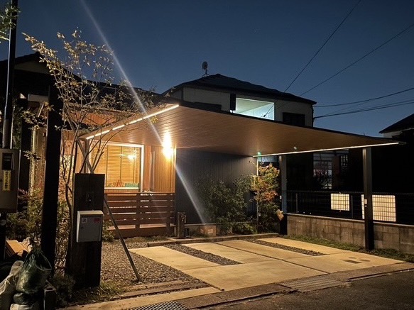 梁を延長させ柱をアプローチラインに被らない位置に設置することで、不便のない納まりとなりました◎しっかりと住宅の軒天下に納まっていますよ✨