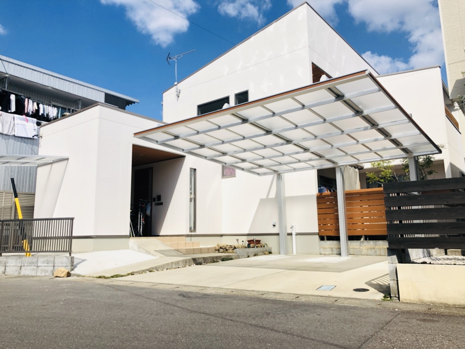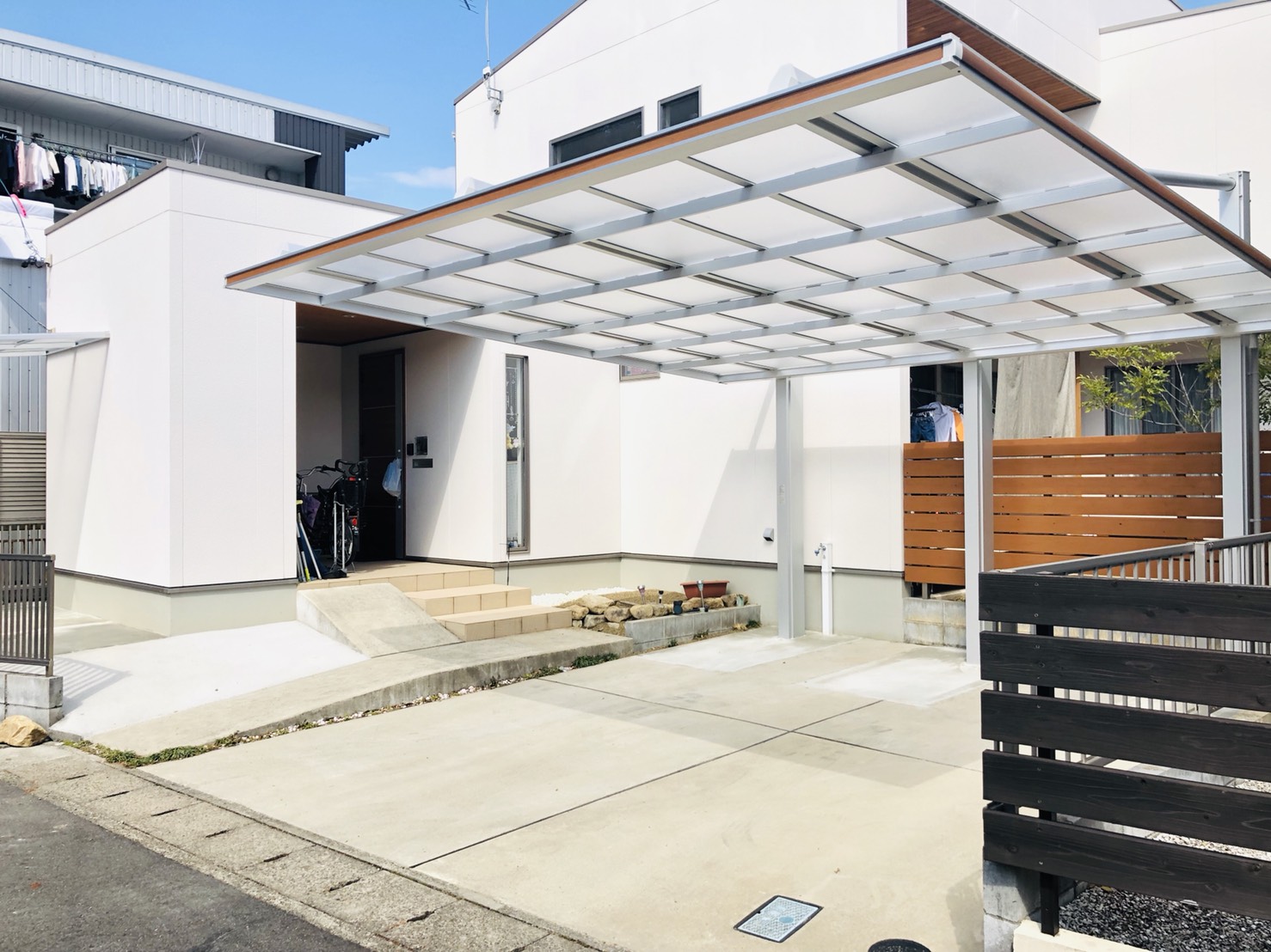 さて、前回ご紹介いたしました片支持のかっこいいカーポート、三協アルミ・ダブルフェースの設置工事が完了いたしました!✨