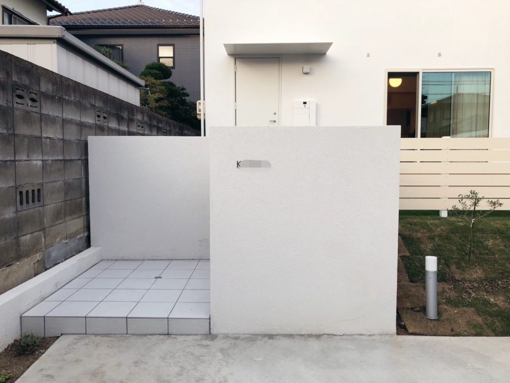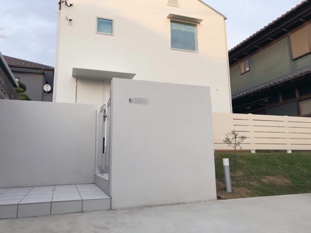 K様の住宅は白に近いクリーム色の外壁カラーセレクトなため真っ白な門塀に白のタイルで