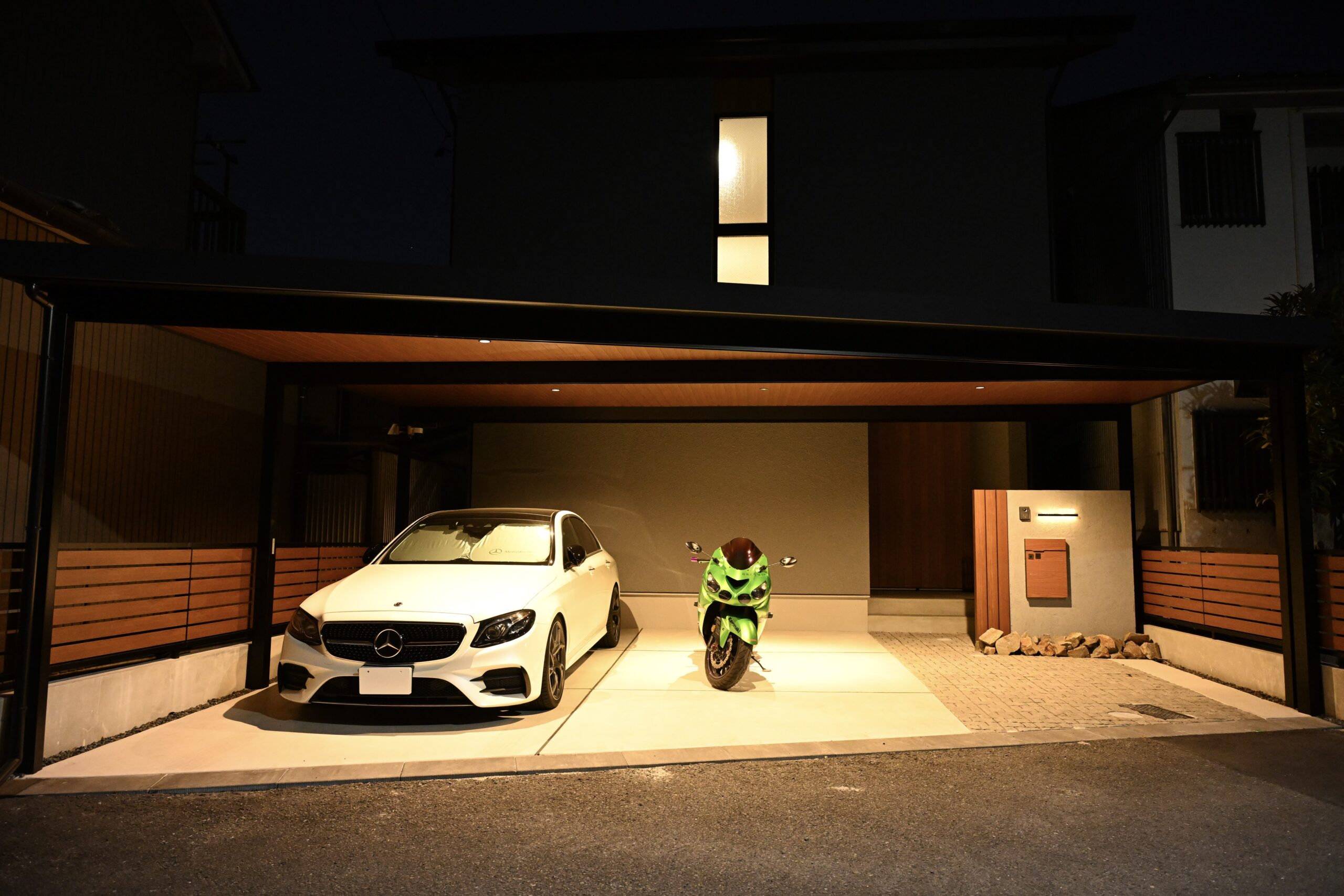 木目天井×ダウンライトの組み合わせで、並んでいる愛車とバイクを更に美しくみせ、「停めているだけで絵になる」空間に仕上がっています。また、このカーポートは敷地サイズにぴったり合わせたオーダー設計のため、玄関やアプローチへの動線・人の出入り・車の乗り入れ、切り返しなど、これらの動線を一切邪魔しないのも大きなメリットのひとつです。