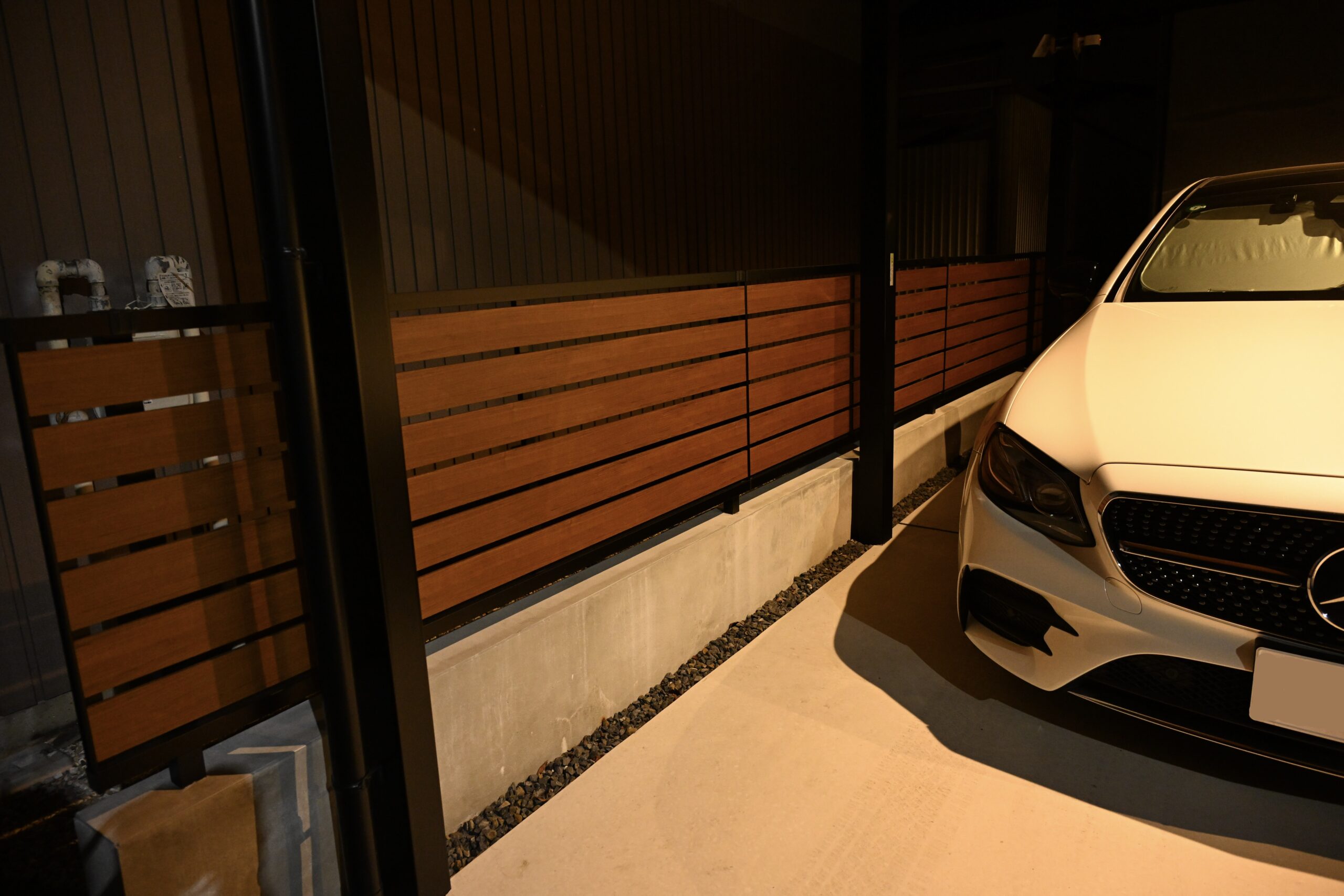 ーダー 高級カーポート 敷地ぴったり 木目天井 ウッド調 ダウンライト 新築外構工事 エクステリア 照明 ライティング 愛知県名古屋市中村区 施工事例|パートナーホーム