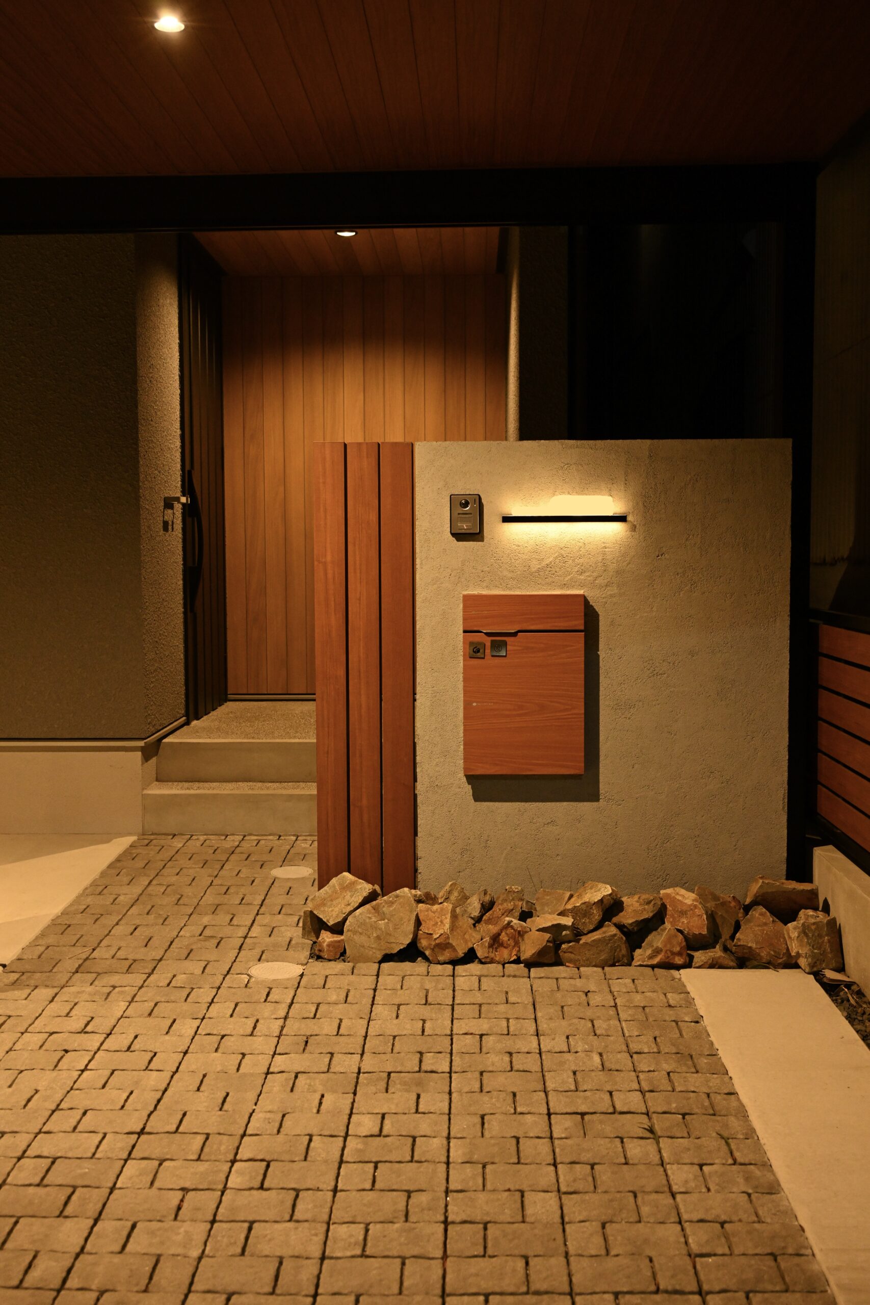 天井には木目材を採用し夜間はダウンライトが柔らかく照らすことで、ただの「駐車スペース」ではなく、建物の一部として完成度の高い外構空間に仕上がっています。