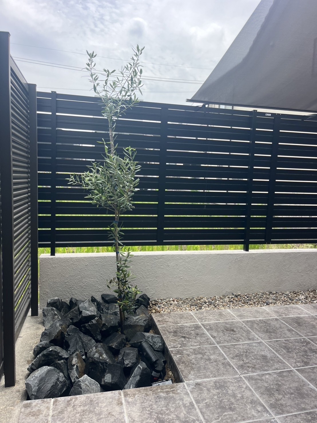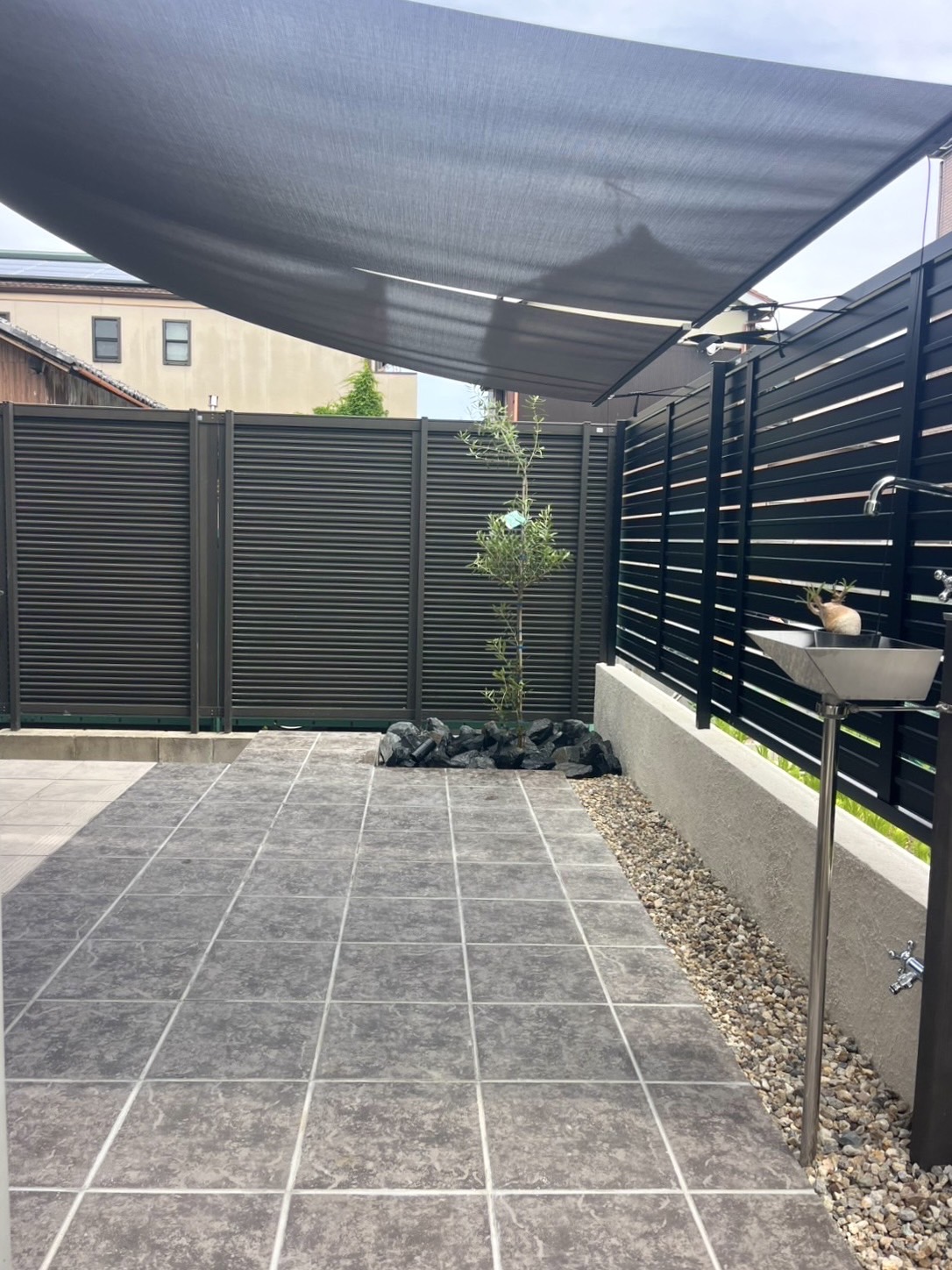 お庭スペースにアルミの目隠しフェンス、地面にはタイルを。LIXILの独立フレームを使用して日除けのスタイルシェードを設置しました💡すっきりとしたメンテナンスいらずのお庭空間の中に割栗石+植栽で彩りをプラス◎日差しが強くなっていく季節にぴったりなのがシェードやポーチテラスです。この度はご依頼頂き誠にありがとうございました✨