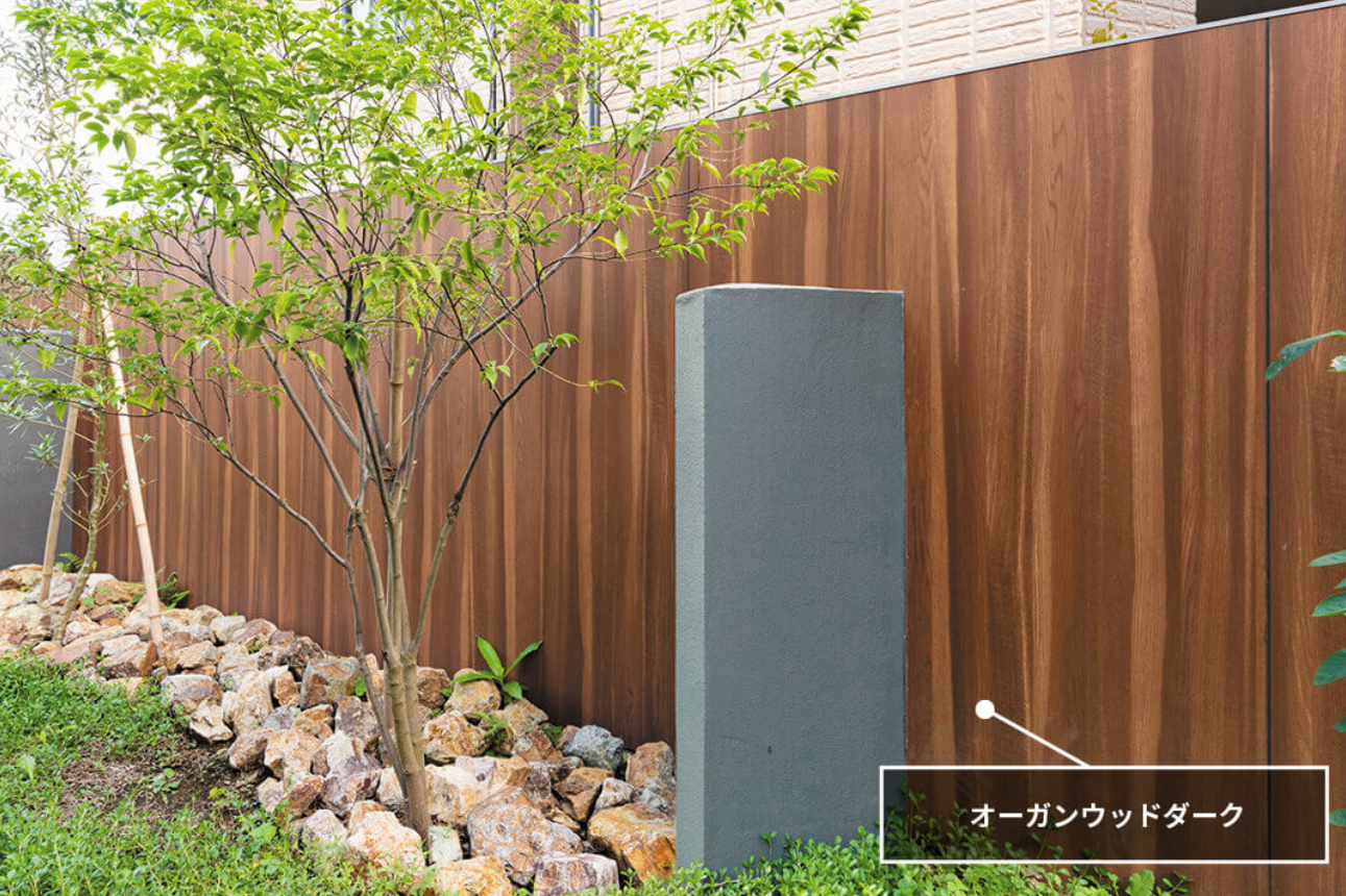 パートナーホーム名東店のフェンスに使われているタカショーのエバーアートボード。アルミ材に様々な表情のシートをラッピングしてフェンス・塀や、門塀等に使用していただけます。