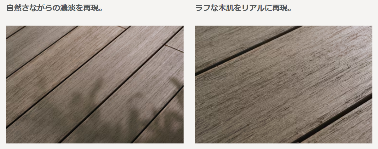 デッキDSは、新開発の「濃淡製法」と「2度削り」で時を経た天然木の見た目と手触りを実現しています。