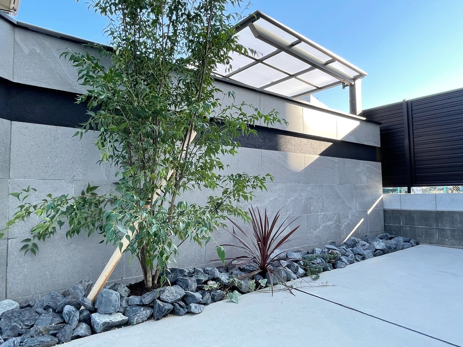 最近ではモダンな外構がトレンドではありますが、モダンというのは近代的・シンプルで都会的でホワイトやグレー・ブラック等の無機質な素材を使った直線的なラインを用いることが多く少しだけ冷たい印象になりがちです。そこが魅力的なスタイルではありますが、もう少しあたたかみが欲しいという方や豊かな外観にしたい場合には植栽や芝などの”緑”を取り入れる事をおすすめします。緑は外観的美しさや豊かさを向上させ、癒しや落ち着きある空間を作り出すことができますよ◎
