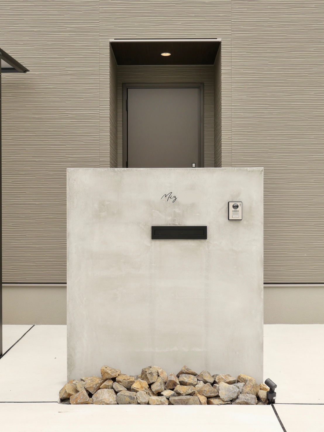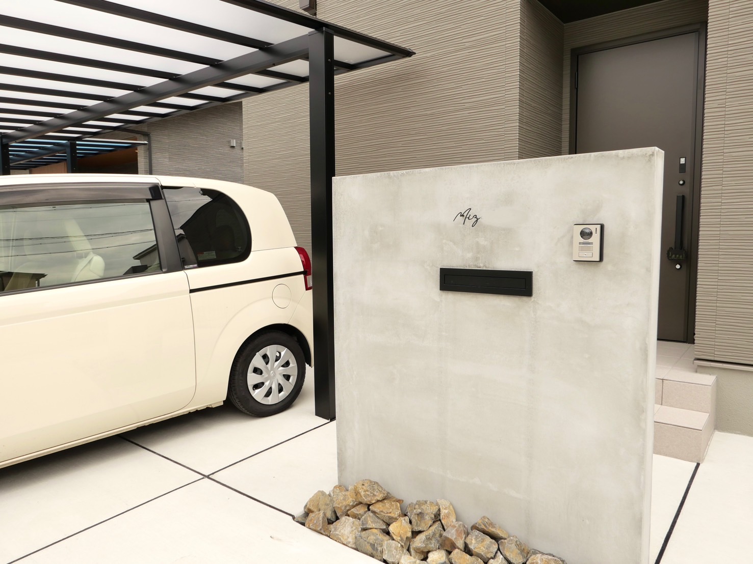 先日新築外構工事の施工写真を撮らせていただきました✨こちらはコンクリートの打ちっぱなしの門塀です。シンプルかつ静かにたたずむ無機質な雰囲気が素敵ですよね♪筆記体のサイン表札はお客様がご用意されたものです。個人名の為一部伏せていますが、打ちっぱなしの塀と良く合いとても素敵です。