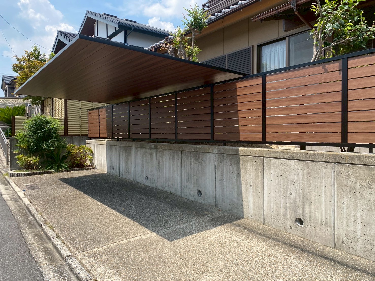 木目調の目隠しフェンスとLIXILカーポートSCを設置しました。お車を最大限駐車できるよう、なんと柱が駐車場側ではなくフェンスの内側(住宅側)に設置されているんです💡屋根だけが駐車場を覆うような外観になっていますね♪