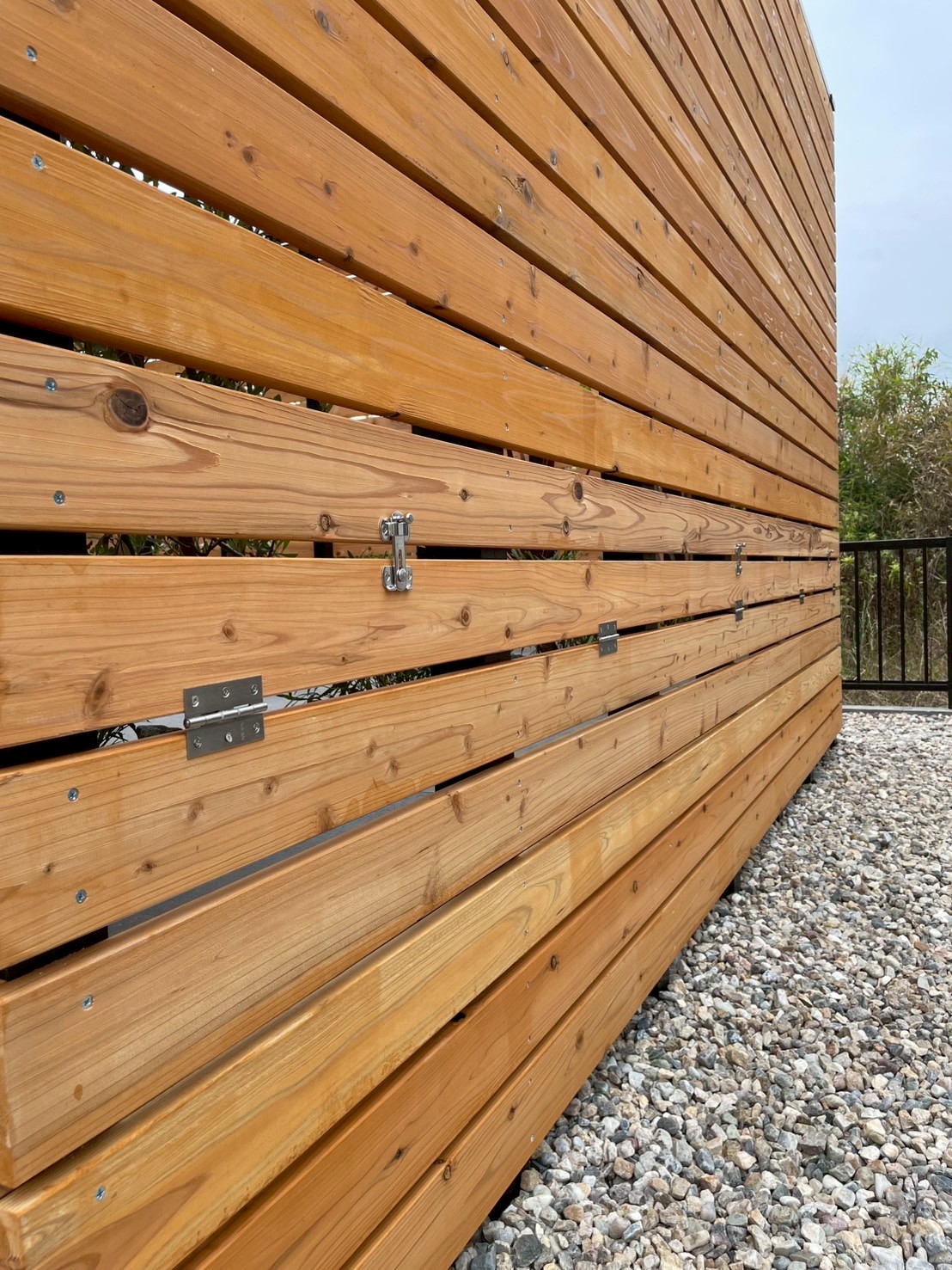 なんとこの囲いフェンスにはちょっとした仕組みが…💭外にある立水栓からホースを通して植栽への水やりや掃除、プールの水溜め等をおこなえるように、一部デッキが開くようになってるんです💡お庭空間に新たに立水栓を設置するコストを抑えた工夫ですね◎