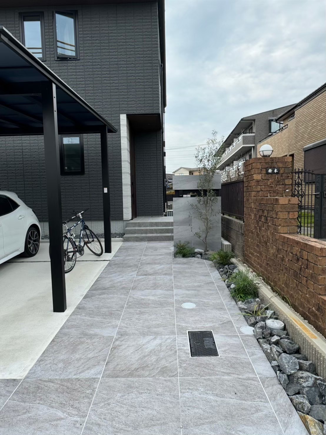 大きなタイルは見た目がすっきりとして高級感があり、お庭や玄関まわりを一層おしゃれに演出してくれます。