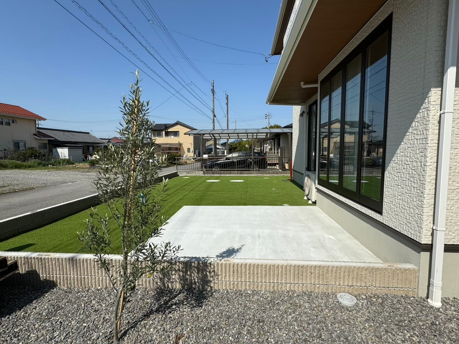 人工芝とコンクリートを組み合わせたお庭に、門塀や乱貼りタイルのアプローチデザイン。機能性とおしゃれさを両立した、暮らしやすい外構となりました。今後お庭まわりに目隠しフェンスを取付できるようなデザインとなっています。