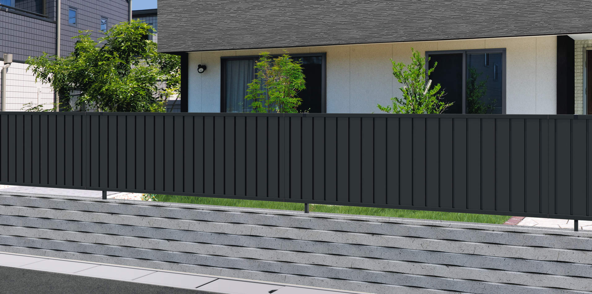 目隠し率 100% 採光率  0% 通風率  0% TM1型(たて目隠し) 三協アルミ 門・フェンスまわり フェンス・スクリーン 目隠し モダン おしゃれ エクステリア 愛知・名古屋の外構専門店パートナーホームのエクステリア 製品一覧 形材フェンス レジリア |パートナーホーム