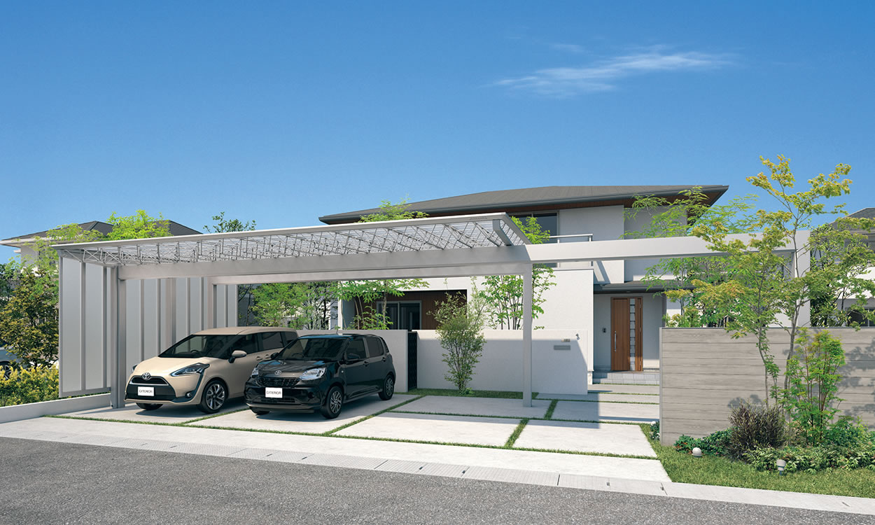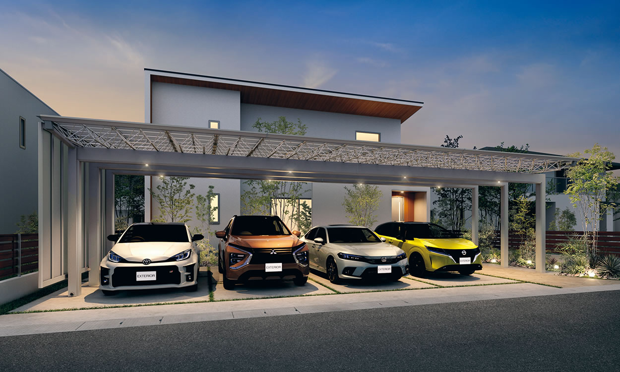 最大4台入庫が可能な間口10mの大型スタイルで、住まいの前面スペースをカバーしたプランです。迫力の屋根サイズに繊細なトラスが空間をモダンに演出。出庫時には魅力のオープンスペースとして用途も多彩です。