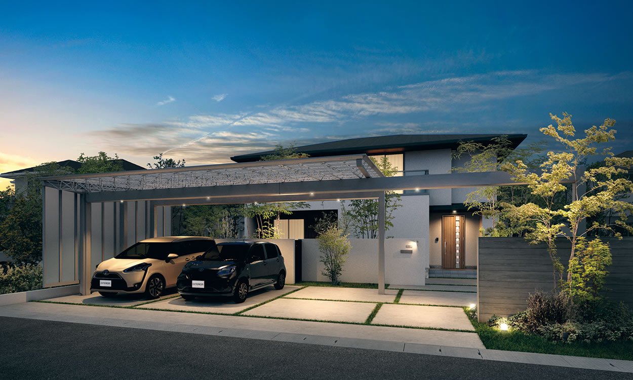 業界最長の12mの延長梁を設定。敷地条件に合わせて障害物を避けて柱を設置したり、フレームをゲートのように使ったり、カースペースだけでなくファサード全体もトータルに演出するプラン提案が可能です。
