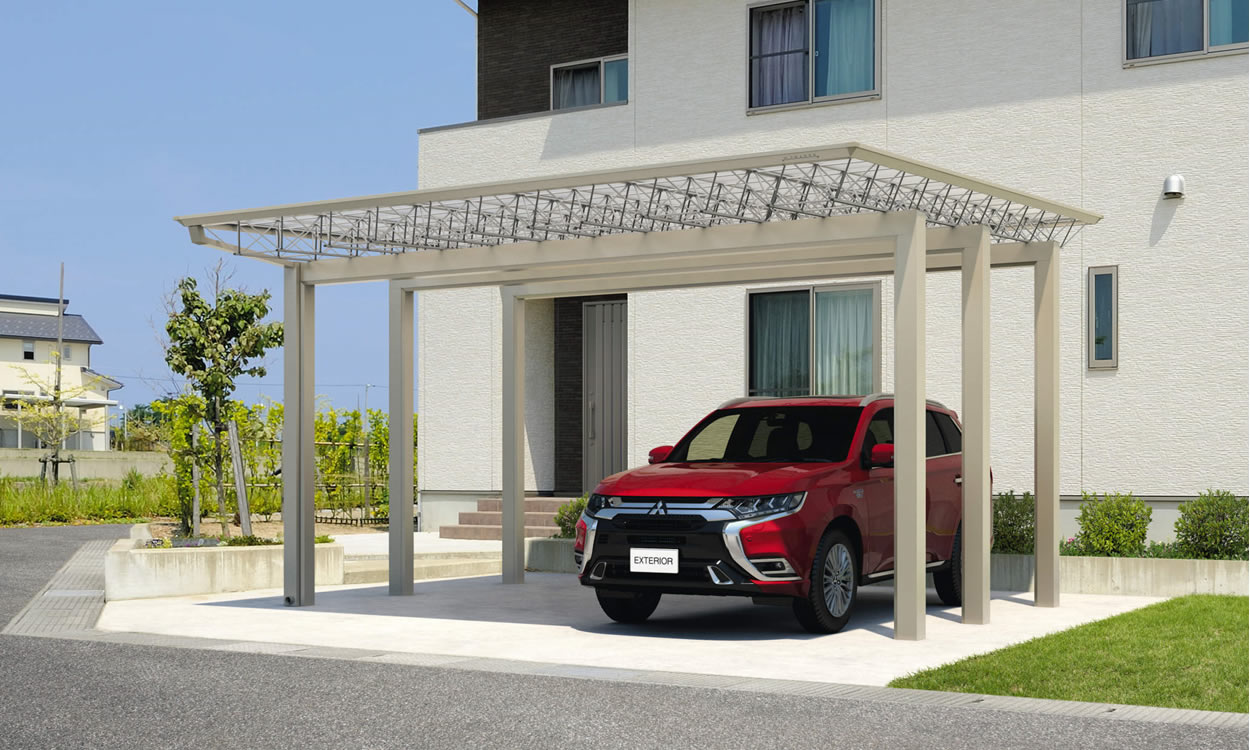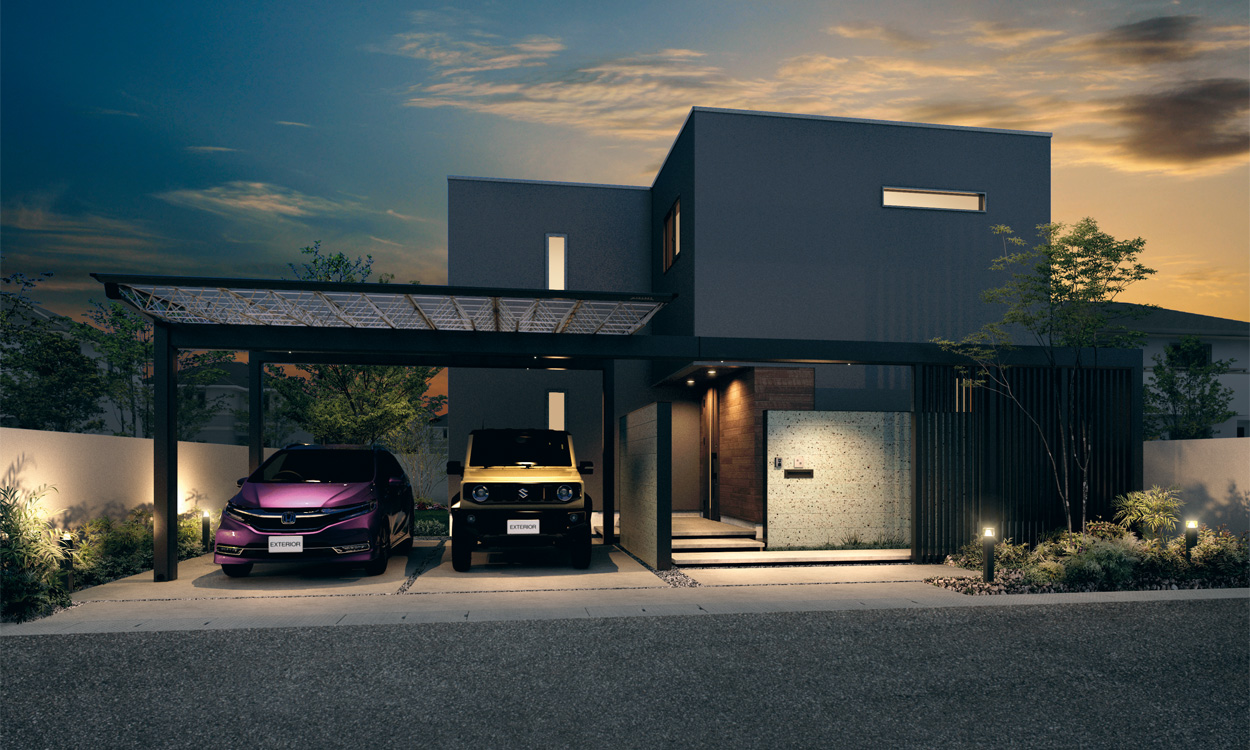 カースペースに映える個性的スタイルでフロントヤードを演出。シンプルな構成ながら、トラスデザインとサンシルバー色がアクセントとなり空間に映え、スタイリッシュでモダンな印象を与えています。