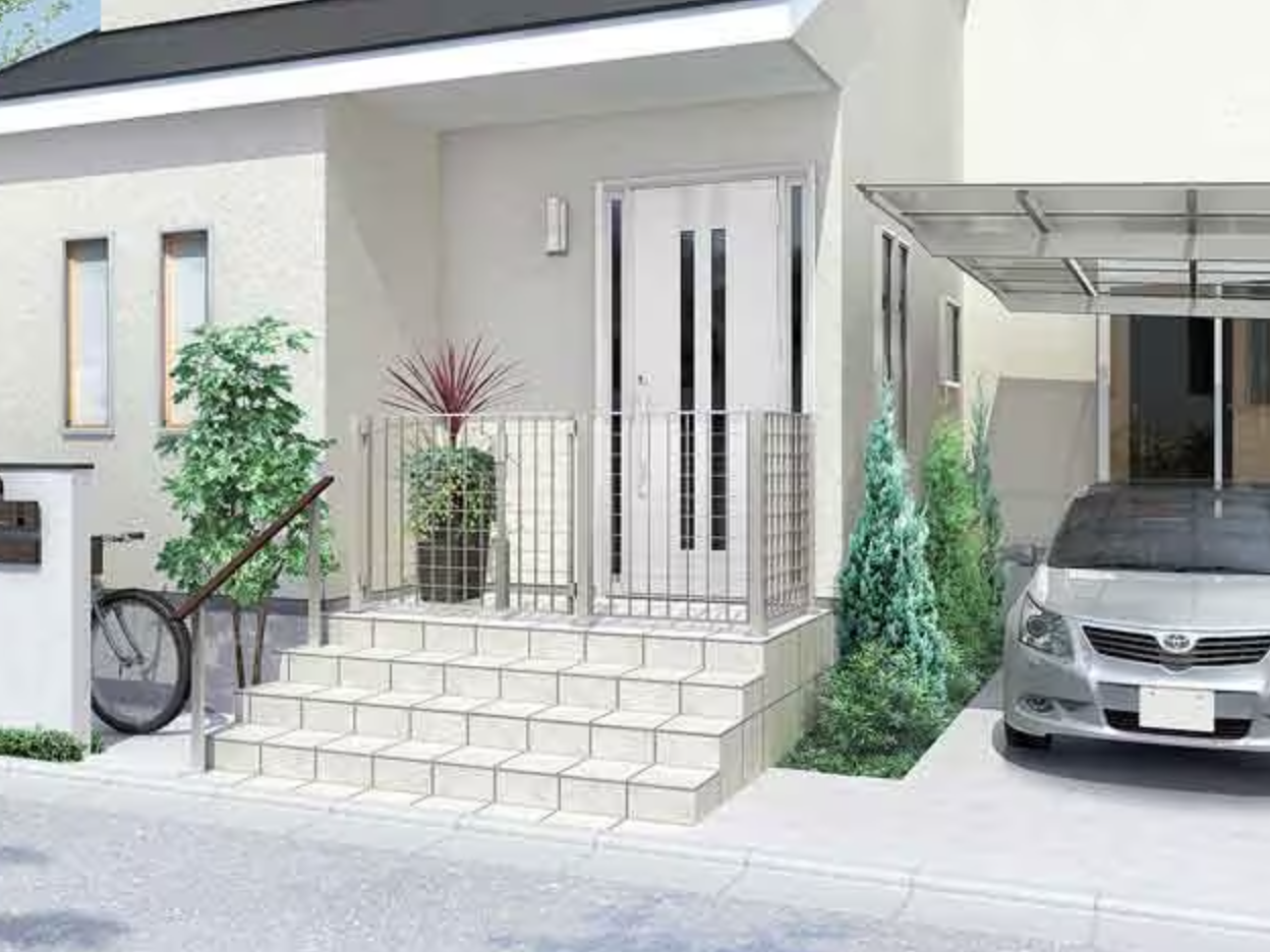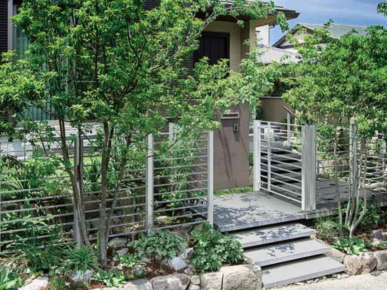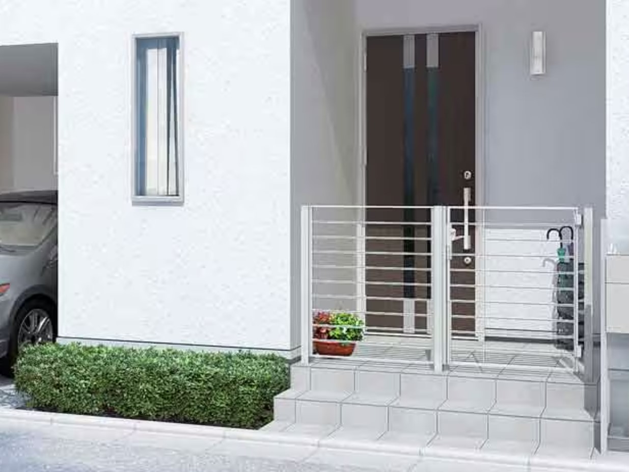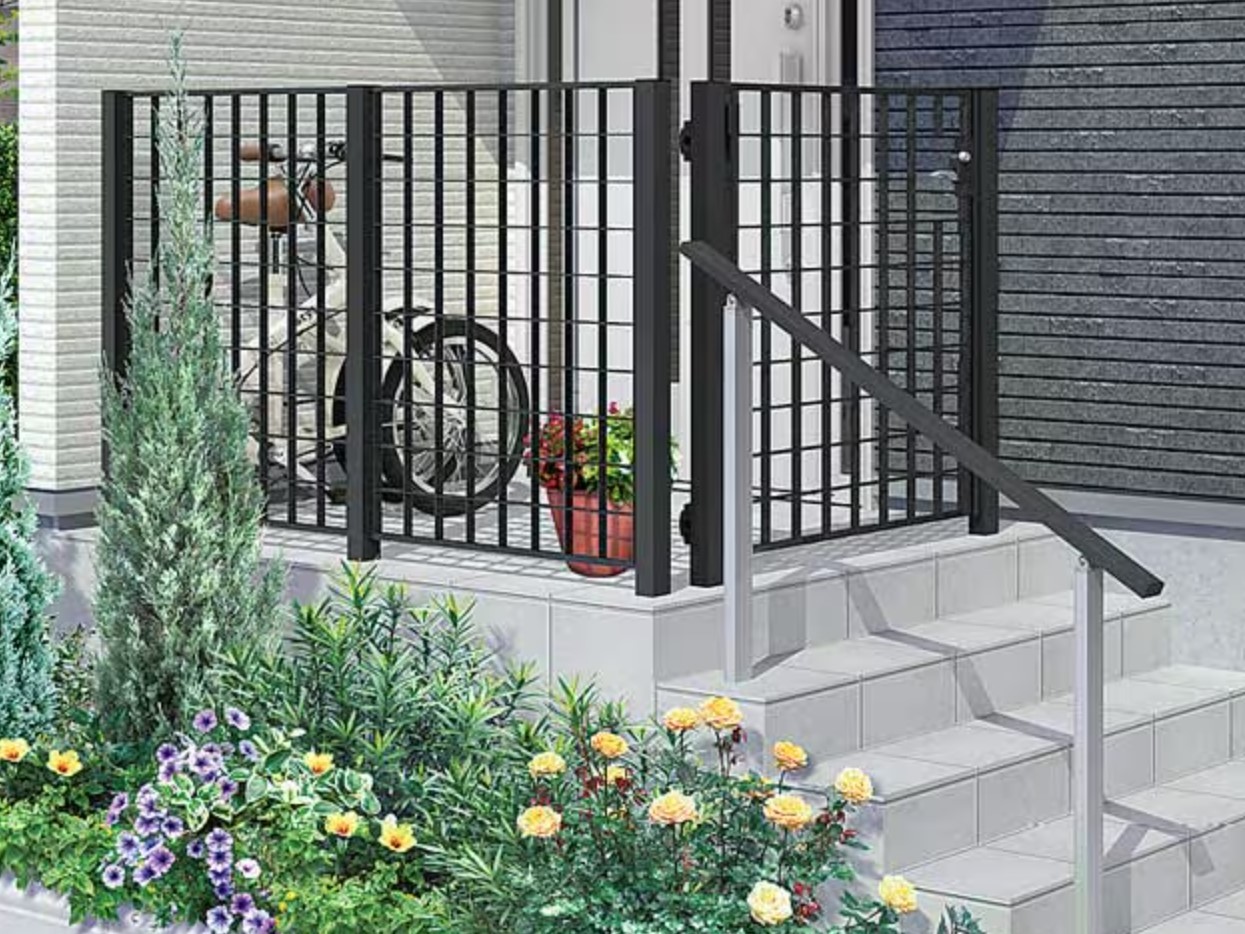 門扉と組み合わせて玄関ポーチをコンパクトに「区切って」、プライバシーとセキュリティを確保します。