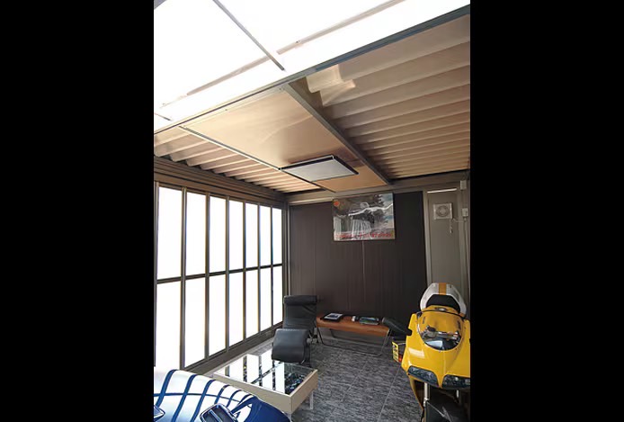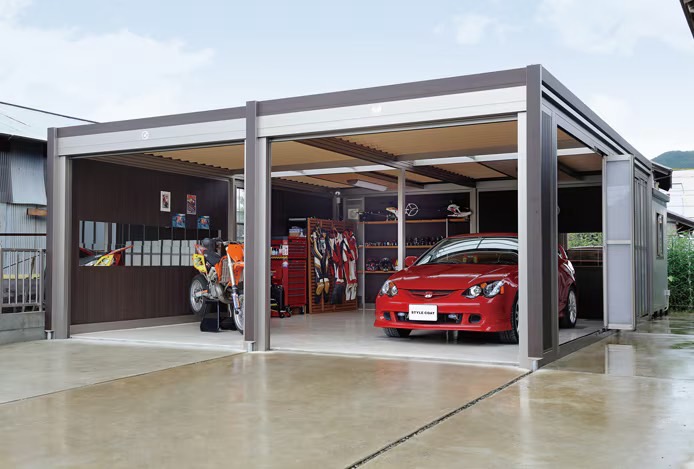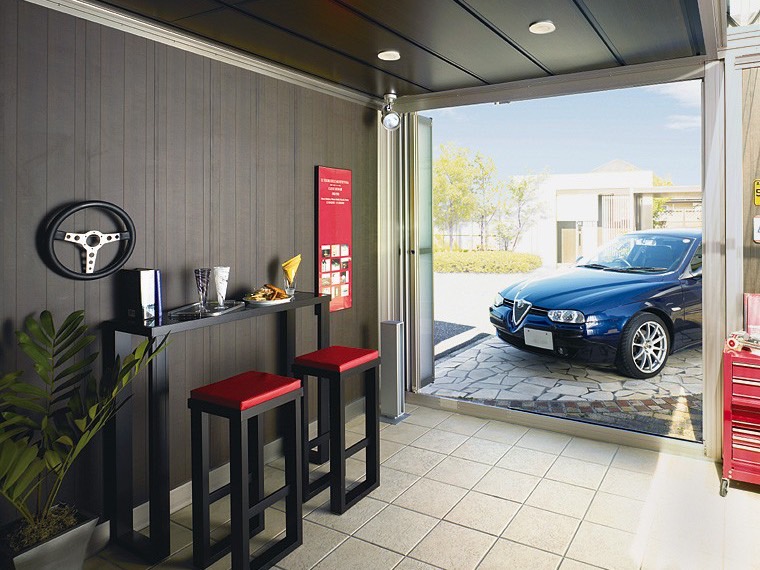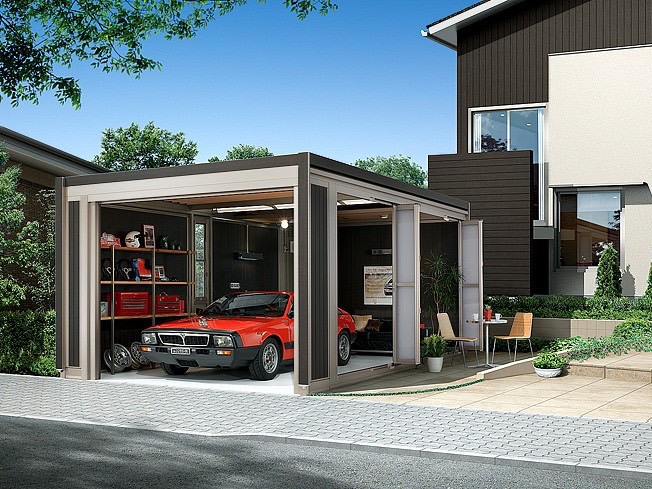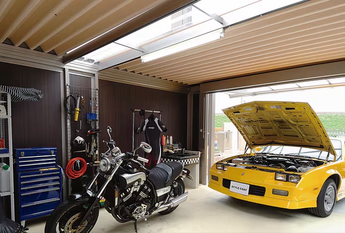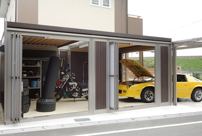 折戸パネルから注ぎ込む陽の光。吹き抜ける爽やかな風。ガレージはじっくり大人の趣味を楽しむための、くつろぎのリビングにもなります。週末は大切な愛車の手入れをしつつ、自分だけの時間を楽しみましょう。共通の趣味を持つ友人がふいに訪ねて来た時は、折戸を開けてオープンカフェのようにするのも良いアイデアです。ゆったりと趣味の話に花を咲かせられる贅沢な空間になります。
