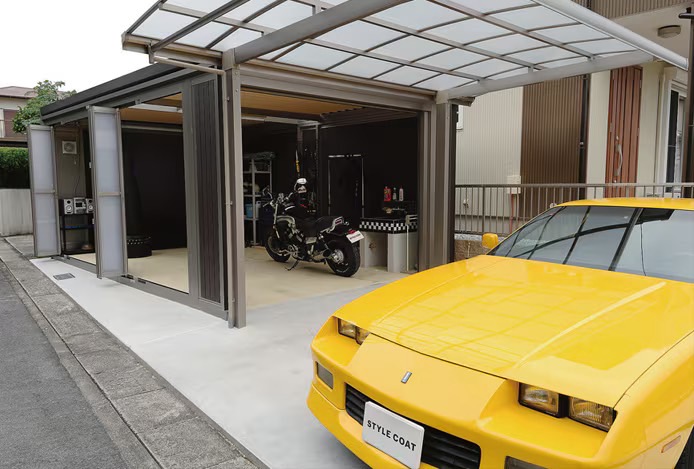 カーポートとつながったスペースは、愛車とふれあえる、わが家のピットガレージ。