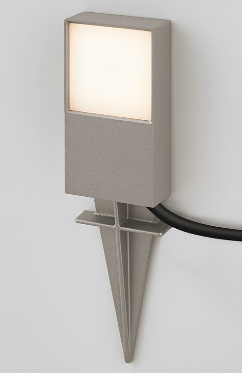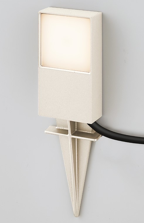 壁際の土に差し込んで設置する「スパイクフットライト」は、根の浅い下草にも差せる長さ90mmの短いスパイクが特長です。壁面へネジで固定する壁付タイプの「フットライト」と用途に合わせて使い分けてください。
