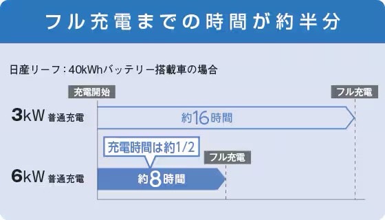 (6kW充電するためには、車両側が6kW充電に対応している必要があります。実際の充電容量・時間は自動車の仕様・制御によって変わります。)